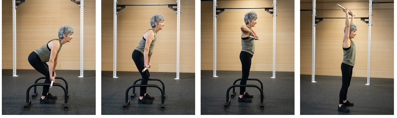 4. 마지막으로 엉덩이와 다리를 완전히 펴고 머리 위로 들고 일어서세요.