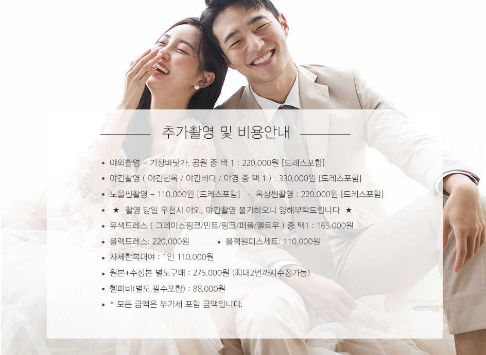 저희가 사진을 잘 안 찍는 편이라 처음에는 이것저것 추가할까 욕심이 났었는데, 플래너님의 현실적인 조언으로 하나만 추가하게 되었습니다. 지금 생각하면 정말 감사한 거 같아요. ㅎㅎ 서비스로 받은 옥상씬도 있고, 야간바다에 서비스 촬영까지 생각하면 드레스만 해도 꽤나 되는데, 여기서 더 추가했더면 정말 힘들었을 거라고 생각합니다. 하지만 우천으로 인하여 추가촬영, 서비스 촬영 다 진행하지 못하였습니다. ㅠㅠ 이 내용은 나중에 스튜디오 촬영 내용을 작성 때 다루도록 하겠습니다.